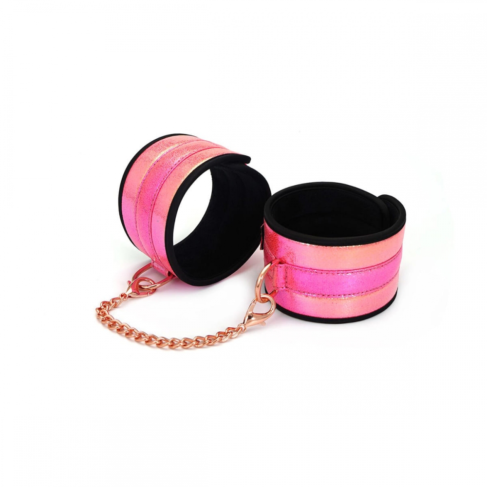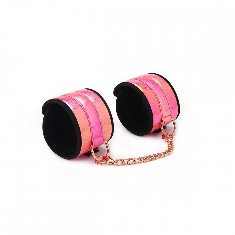 Наручники — с мягкой бархатной вставкой и соединительной цепочкой на карабинах. Регулируются липучкой. Размер: 24,5×6 см, цепочка 16 см.