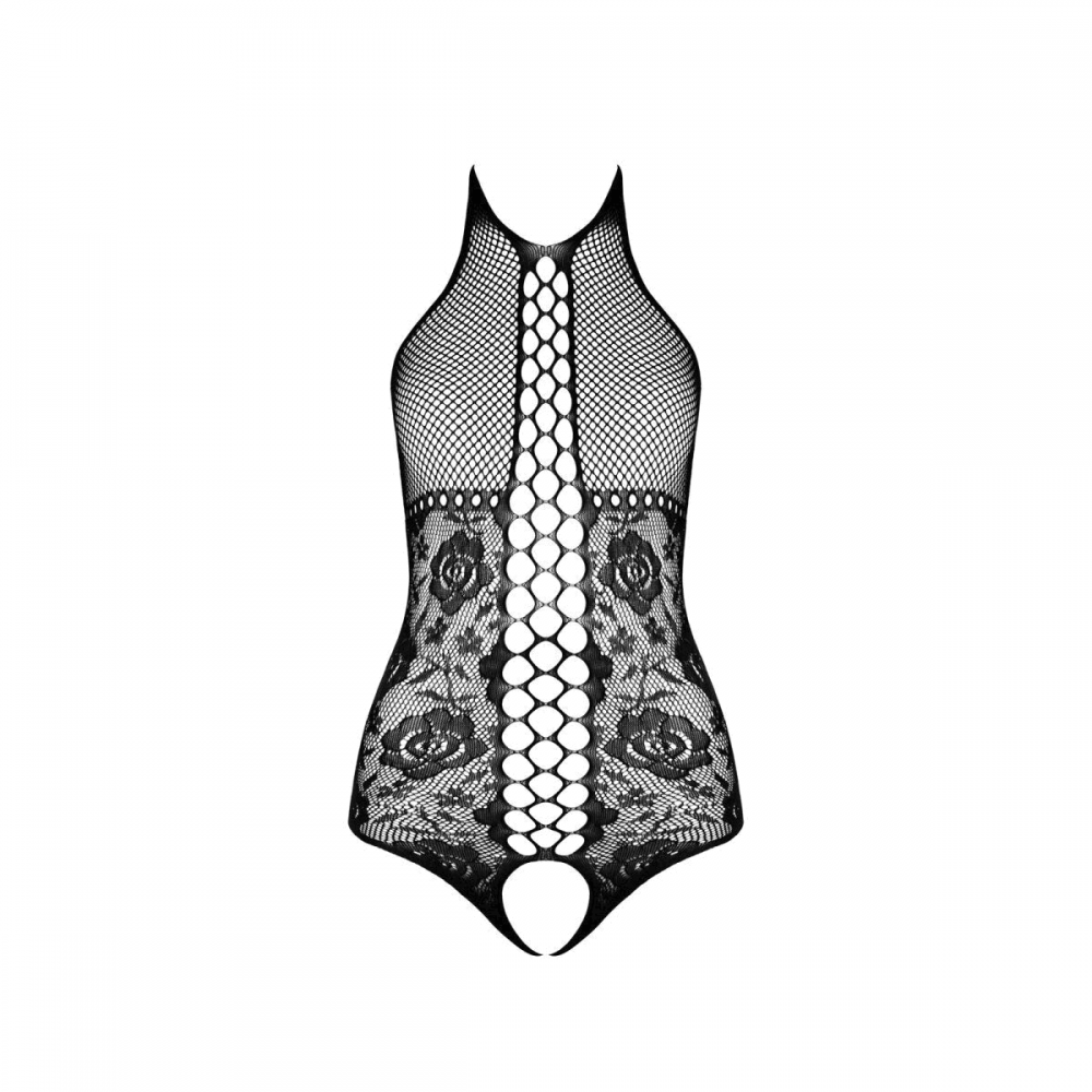 Цветочный орнамент визуально стройнит, а плетение, напоминающее корсетную ленту, проходит вдоль животика и эффектно удлиняет силуэт. Воротник-халтер открывает плечи и спинку, добавляя образу элегантности. А смелая деталь — открытый доступ в интимной зоне — позволяет воплотить самые пикантные фантазии, не снимая изделие.