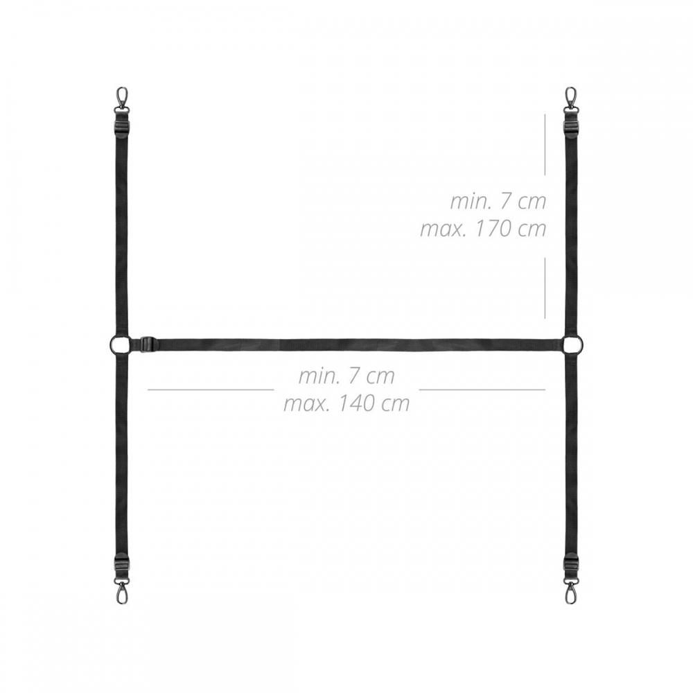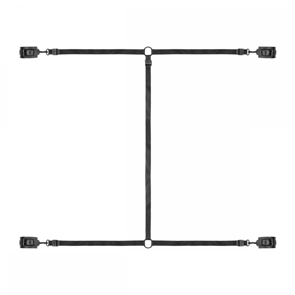 Просто разместите широкие ремни под матрасом, отрегулируйте их под размер кровати и зафиксируйте запястья и лодыжки партнёра с помощью наручников и поножей. Конструкция надёжно удерживается весом тела и даёт простор для множества поз.