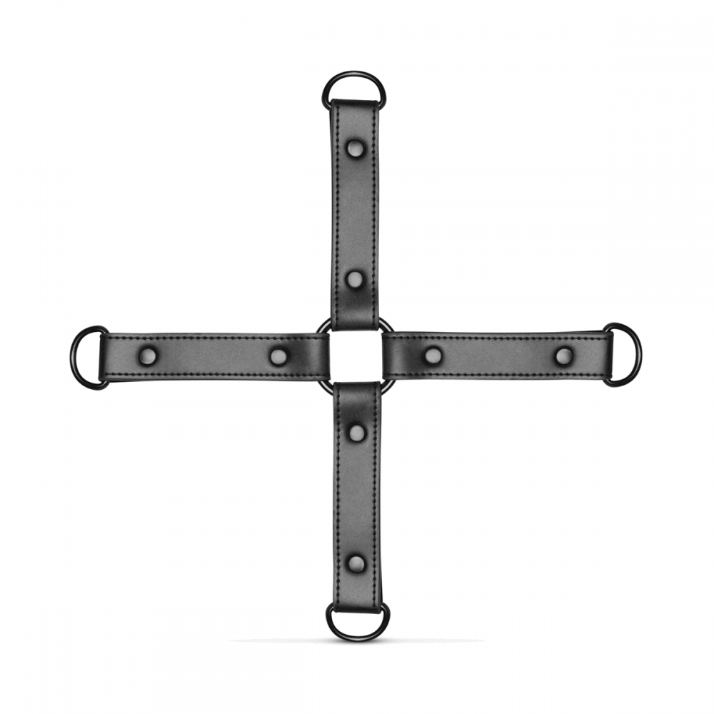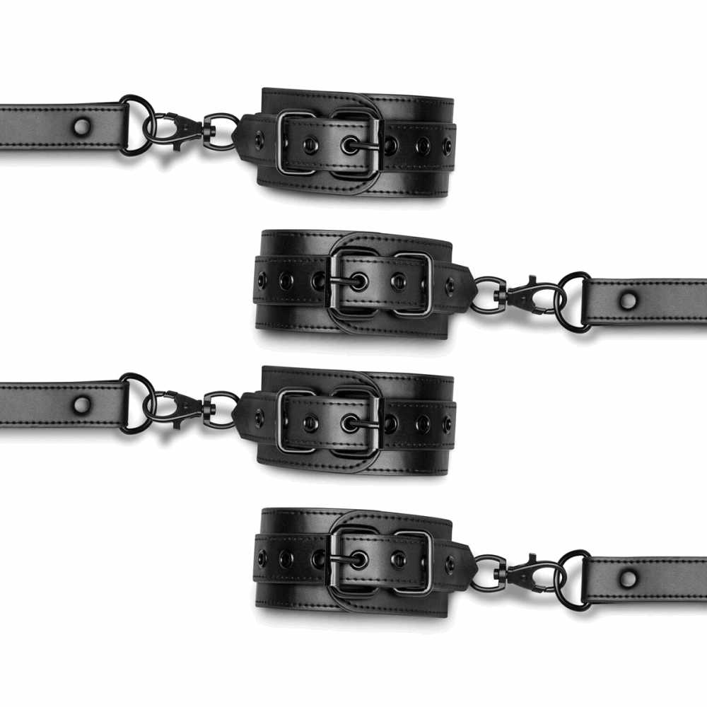 Все элементы выполнены из веган-френдли искусственной кожи, которая мягко ложится на кожу, не натирая запястий и лодыжек, но при этом обеспечивает надёжную фиксацию. Крестовина с карабинами позволяет моментально соединить наручники и поножи, обездвижив партнёра всего за несколько секунд.