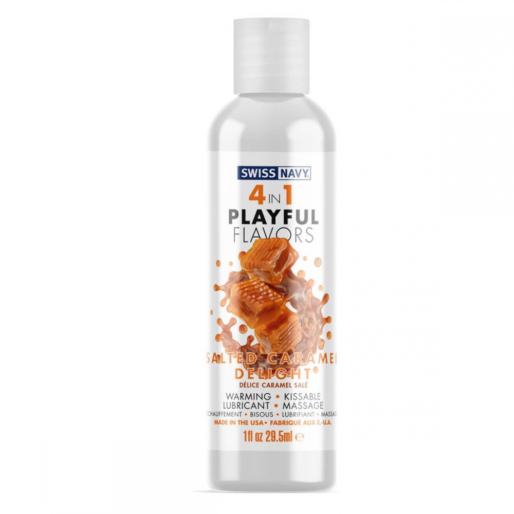 Swiss Navy 4 In 1 Salted Caramel Delightлубрикант на водной основе, который сочетает в себе смазку, массажное масло, увлажняющий лосьон и средство для оральных ласк. Его нежная, шелковистая текстура обеспечивает комфортное скольжение, а соблазнительный вкус соленой карамели добавляет пикантности вашим интимным моментам.