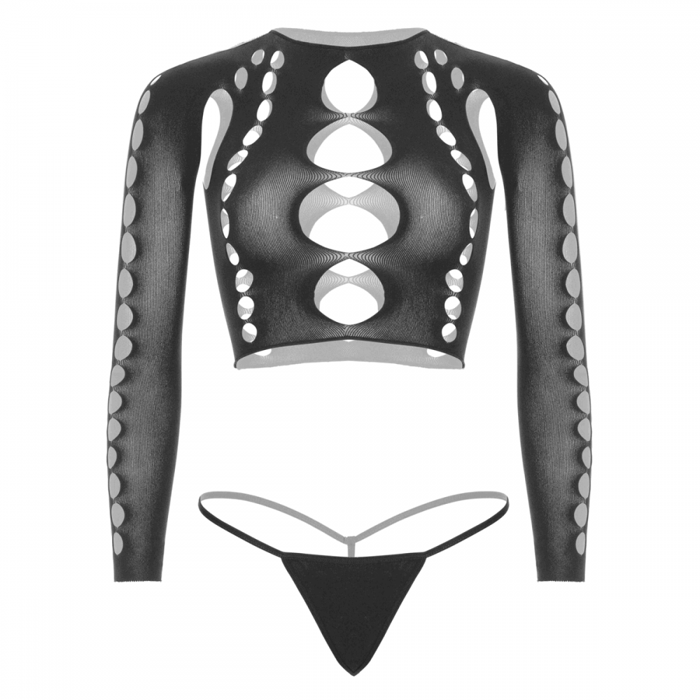 Короткий топ із довгими рукавами щільно облягає груди, не приховуючи, а ефектно підкреслюючи її. Безліч вирізів різних форм утворюють оригінальний геометричний візерунок, крізь який спокусливо проглядає шкіра. Довгі рукави з петлею для великого пальця виглядають стильно і додають особливість образу. У комплект також входять мінімалістичні стрінги в тон ідеальне завершення сексуального вбрання.