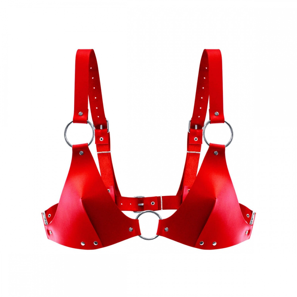 Регульовані ремінці на плечах і спині забезпечують ідеальну посадку, а блискуча поверхня, що нагадує лаковану шкіру або латекс, надає виробу зухвалого та ефектного вигляду. Червоний колір підкреслює пристрасть та енергію, роблячи топ ідеальним вибором як для BDSM-образу, так і для яскравих вечірок та фестивалів.