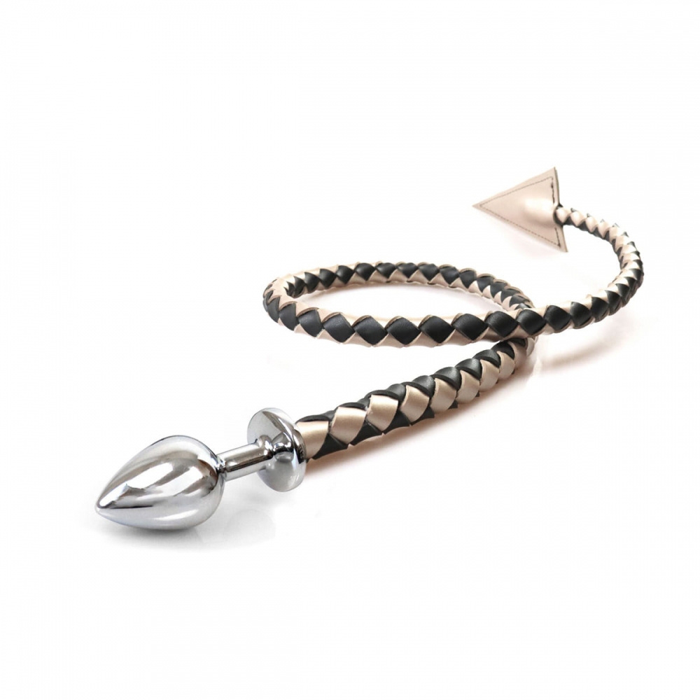 Пльотка-хвіст Art of Sex - Succubus - оригінальний аксесуар для БДСМ-практик та рольових ігор. Девайс поєднує функції батога для флагеляції та анальної іграшки завдяки гладкій та важкій металевій пробці. Контраст холодного металу та гнучкого батога зі штучної шкіри створює яскраві та незвичайні відчуття.